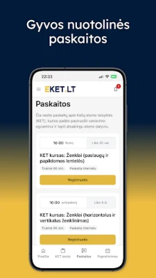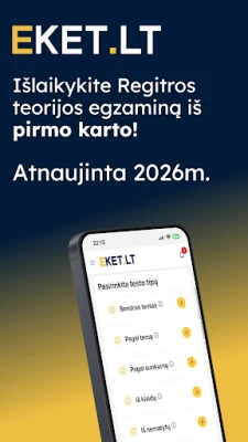 Lisaks ulatuslikele testidele ja õppematerjalidele toetab EKET.LT Sind ka praktiliste vajadustega. Hangi esmaabikursuse tunnistus otse rakenduse kaudu, mis on Regitra eksamil kohustuslik. Me saame aidata ka eksamiaja kiirendamisel, et Sa ei peaks pikalt järjekordades ootama. EKET Bilietai 2026 KET Testai Bilietai on kättesaadav mitmes keeles – leedu, inglise ja vene keeles, et muuta õppimine mugavaks kõigile. Meie eesmärk EKET.LT-s on selge: pakkuda terviklikku platvormi, mis annab Sulle kindluse rooli minna. Tu vairuosi!