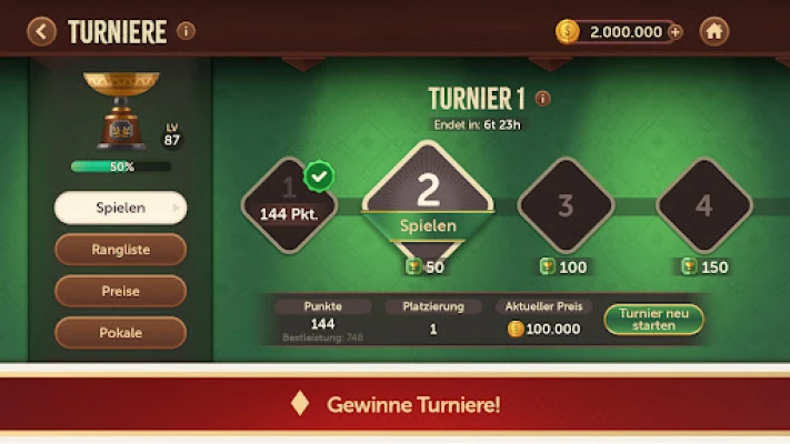 Avastage mitmekesisus ja sügavus, mida Skat Treff pakub, tänu hoolikalt läbimõeldud funktsioonidele: elavad matšid teiste mängijatega, mis hoiavad iga vooru pingelisena ja ettearvamatuna. Tagame ausa mängukogemuse kaardijaotusega, mis järgib statistilist normaaljaotust, et iga käsi oleks tõeliselt juhuslik ja õiglane. Valige oma eelistuse järgi kolme erineva kaardipaki vahel: klassikaline Altdeutsches, elegantne Französisches või ametlik Turnier-Blatt. Mängige vastavalt turniirireeglitele või vabamatele "kõrtsireeglitele" – mõlemal variandil on oma võlu, proovige järele! Pange oma oskused proovile liigamooduses, kus saate tõusta edetabelites ja pärjatud meistriks! Lisaks on teil alati käepärast kasutajasõbralik rakendus, põhjalikud abilehed ja Saksa klienditugi, et tagada sujuv mängukogemus ja aidata teil lauamängude profiks saada.