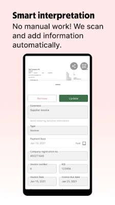 Jäädvustage oma kulutused hetkega, pildistades või skaneerides kviitungeid ja tarnijaarveid otse oma nutitelefoniga. Digitaalselt töödeldud dokumendid edastatakse sujuvalt ja turvaliselt teie eelistatud raamatupidamissüsteemidesse, olgu nendeks Spiris, Visma Administration, Visma Fivaldi või Visma Netvisor. See tagab andmete kiire ja veatu liikumise, välistades käsitsi sisestamisega seotud vead ja säästes väärtuslikku aega. Lisaks pakub lahendus tuge ka QR-koodide haldamisele, pakkudes veelgi suuremat paindlikkust ja efektiivsust andmete töötlemisel.